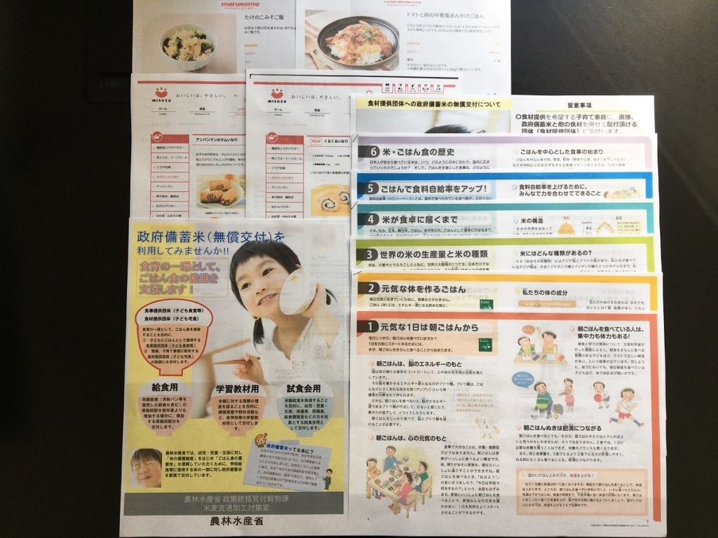 政府備蓄米のお届けの際は、食育の取組として、お米が作られる過程~ごはんが食卓に並ぶまでの流れやごはんの栄養や必要性を記載したチラシ。また、えんまるに食材を提供していただいている食品企業さんの商品とごはんを組み合わせた調理方法のレシピを同封します。