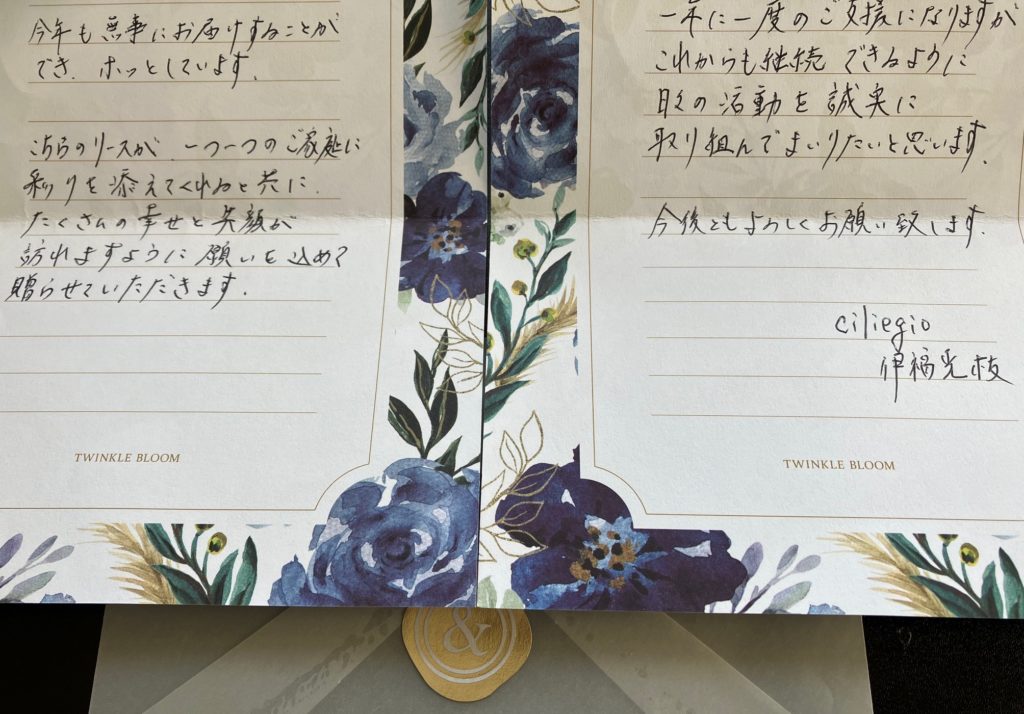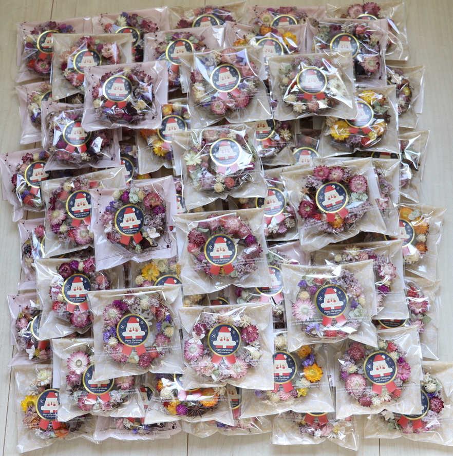 そして、今月は12月に向けて特別なリースのプレゼントもありました。福岡県福岡市のフラワーアーティスト「Ciliegio」さまから、生花を加工したドライフラワーの「クリスマスリース」のギフトです。(Ciliegioさんからは、毎年素敵なリースをお届けいただいています。3年前、一昨年、昨年)