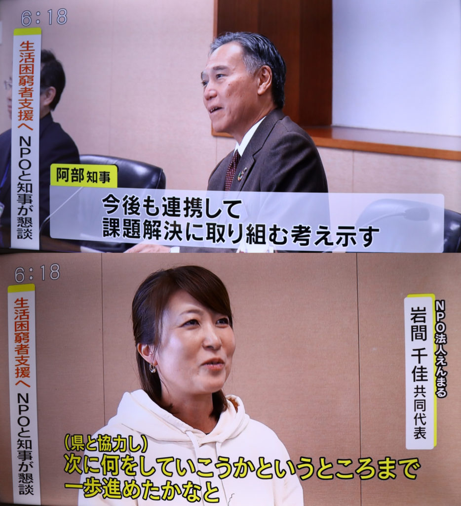 地域で孤独や困難を抱えている方々の現状や課題、そして解決に向けたえんまるの様々な取り組みについて直接お話させていただきました。阿部知事、担当部署の皆さま、そしてていねいに事前準備をしてくださった広報・共創推進課の皆さま、この度はありがとうございました。
