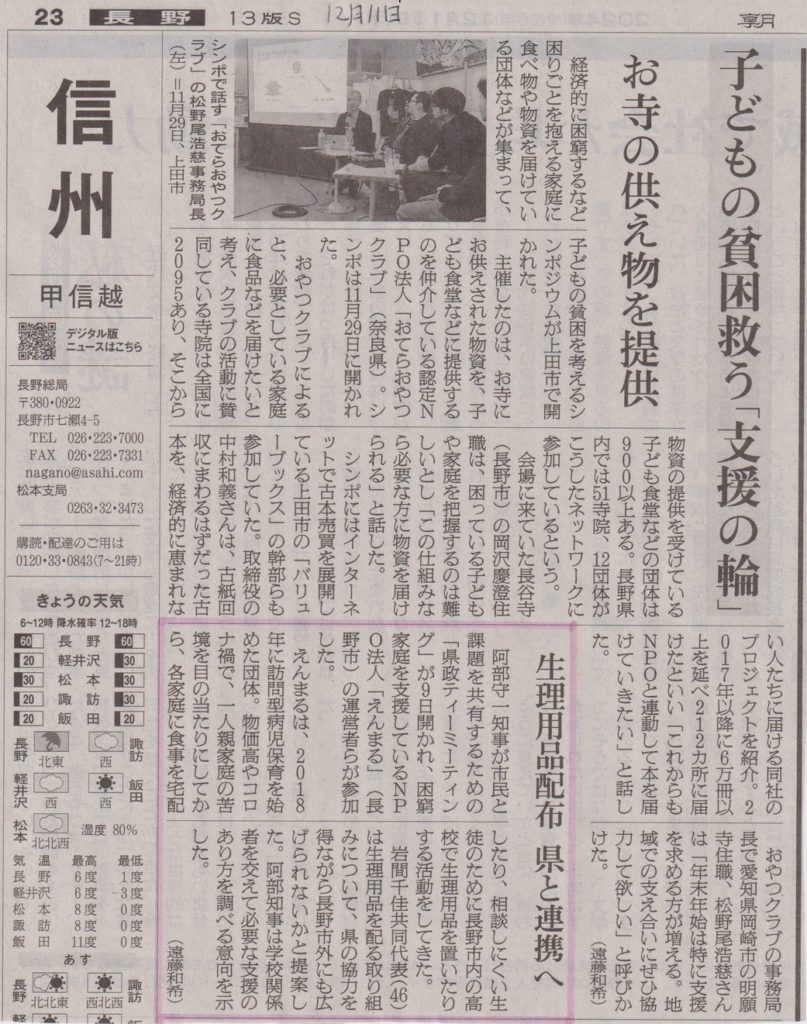 12月11日の朝日新聞さん朝刊にも「県政ティーミーティング」の事を取り上げていただきました。主に生理用品配置についての事を取り上げていただいてます。(長野市民新聞さんも取材いただきました。)メディアの皆さまもご対応ありがとうございました。