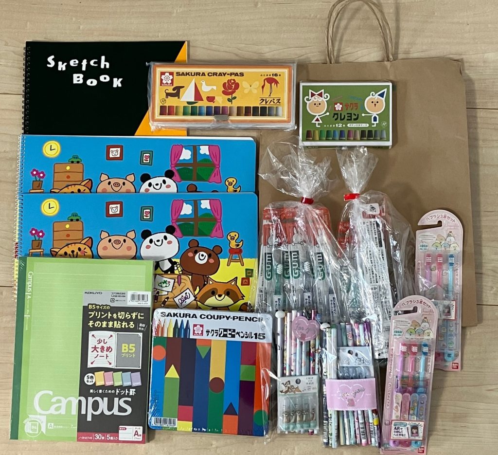 こちらが1世帯にお届けした文房具セットの一例です。 スケッチブックやノート、色鉛筆、ペン類など、新学期を迎えるために必要なアイテムが含まれています。すべて寄付や寄付金で購入させていただいた文房具を、こどもたちが安心して新学年を迎えられるよう、心を込めてていねいに整理・調整し、家庭ごとにお渡ししました。