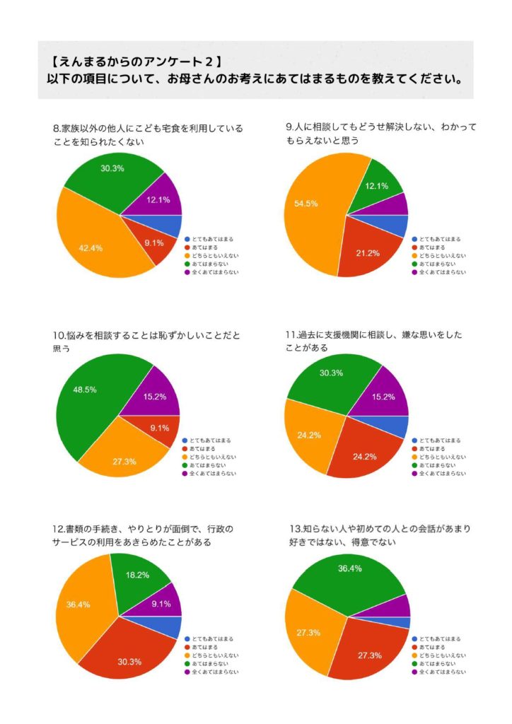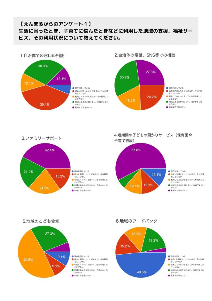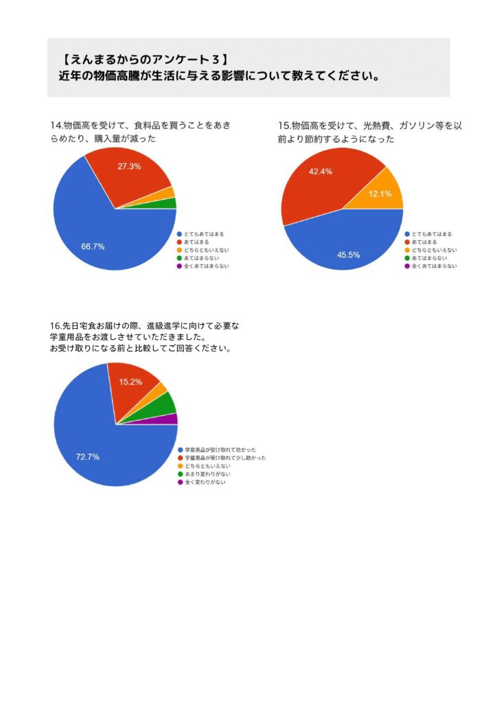 毎年、ひとり親家庭の生活状況を確認するために、こども宅食えんまる便の利用家庭にアンケート調査をおこなっており、今年度も実施いたしました。