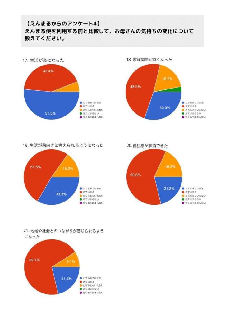 「とてもあてはまる」と「あてはまる」の合計として、1:生活が楽になった 93.9% 2:家族関係が良くなった 79% 3:生活が前向きに考えられるようになった 85% 4:孤独感が解消できた 82% 5:地域や社会とのつながりが感じられるようになった 91%との回答をいただきました。