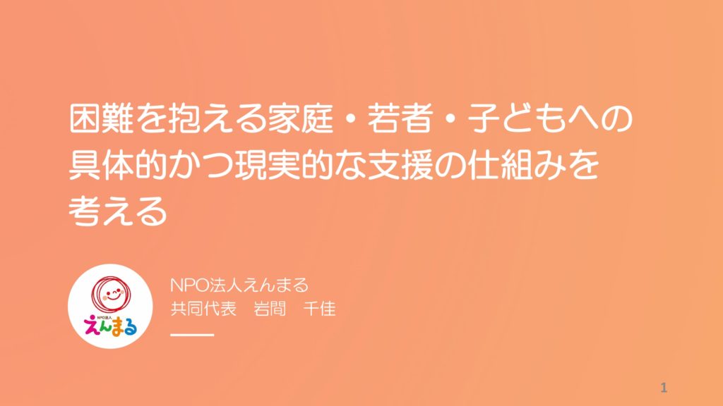 ご自身の実体験を通して保護者、ひとり親家庭への支援をされていて刺激を受けました。えんまるの梱包作業をお手伝いさせていただいた時に、みなさんが各ご家庭のことを考えながらお仕事をされていて、素敵だなと感じました。具体的な事例を用いてグループワークをした時に対応が難しいと感じました。各家庭の状況は様々でパターン化できるものでは無いので、その瞬間に対応することはすごく難しいなと思いました。えんまるの活動が児童養護施設の支援まで広がっていることを知り、子どもたちの幸せのために自分が出来ることを考えて行動したいと思います。ありがとうございました。