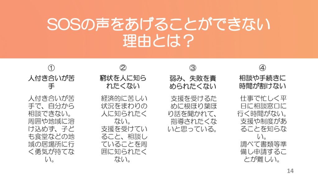 ひとり親家庭の支援の場があっても、その場に行くことが出来ない人も沢山いる訳で、そういう見えないところで悩みを抱えている人達にどうアプローチしていくかを考えていくことが求められると気付かされました。孤独感を抱く人々の心の拠り所を作ることの大切さと、きっかけ作りの難しさを感じました。