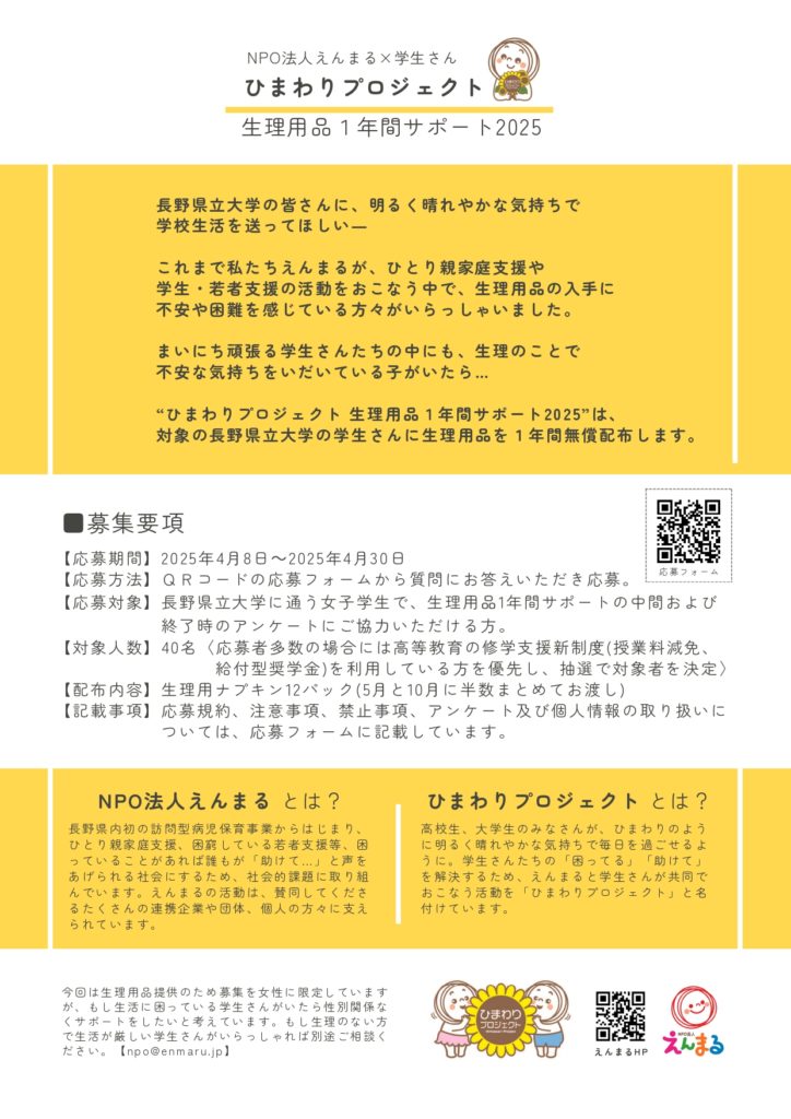 この度、困りごとを抱えている方に、ピンポイントに直接支援を届けるために、長野県立大学の学生さんを対象とした「ひまわりプロジェクト 生理用品1年間サポート2025」を始めました。