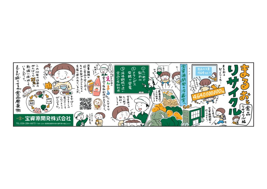広告では、まるおくんが宝資源開発さんの会社を訪れ、食品の再利用についてお話を聞く内容になっており、廃棄食品の利用として、①たい肥や飼料化、②メタンガス発酵による発電、③賞味期限が近い食品の有効利用について紹介されています。(宝資源開発さんでは①のたい肥や資料にしているそうです!)