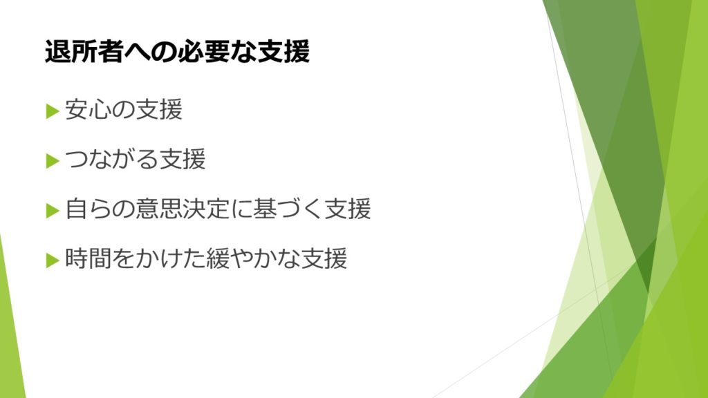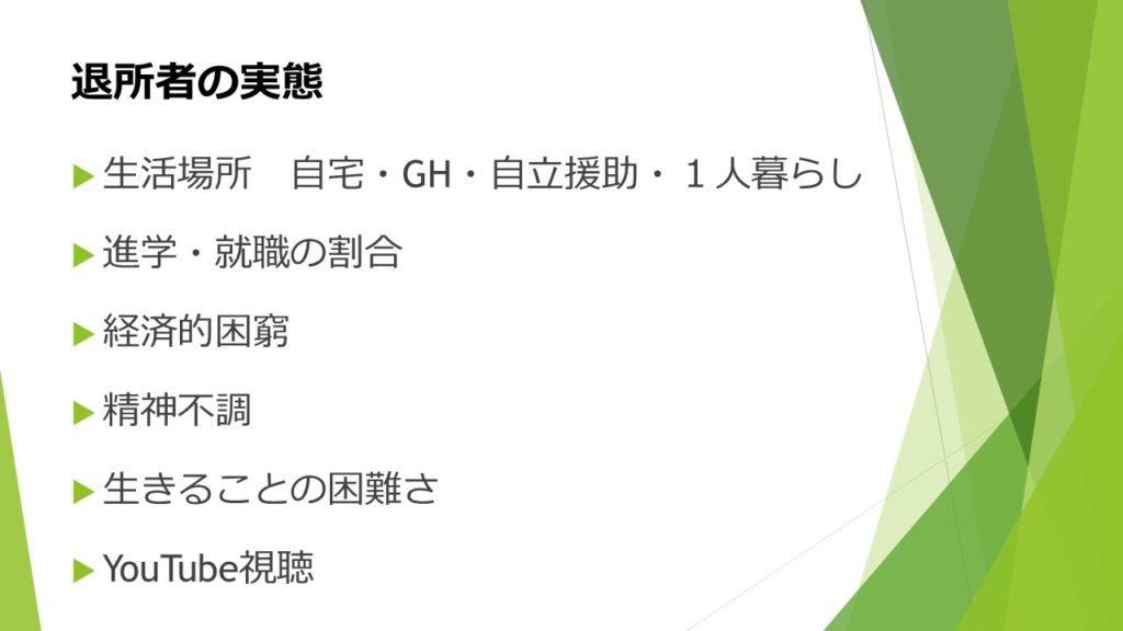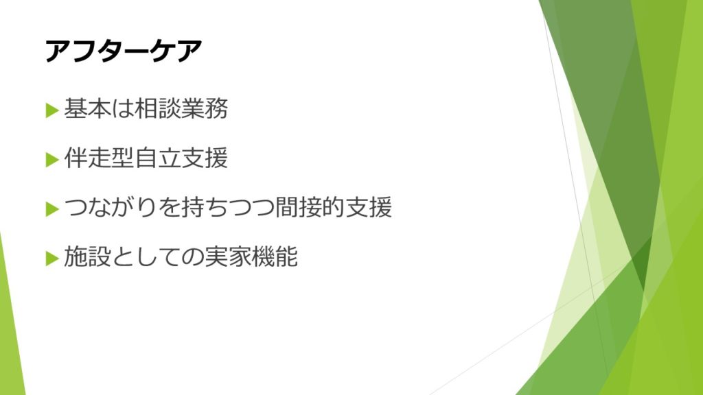 ・インケアやリービングケアやアフターケアなどの言葉は知っていたがちゃんとした意味を理解できていなかったので今回の講義を通してしっかり理解することができて良かったです。なぜ支援が行き届いてないのか疑問に思っていたが、人付き合いが苦手だったり、弱みや失敗を責められたくないなどの理由を知ることができ納得することができました。