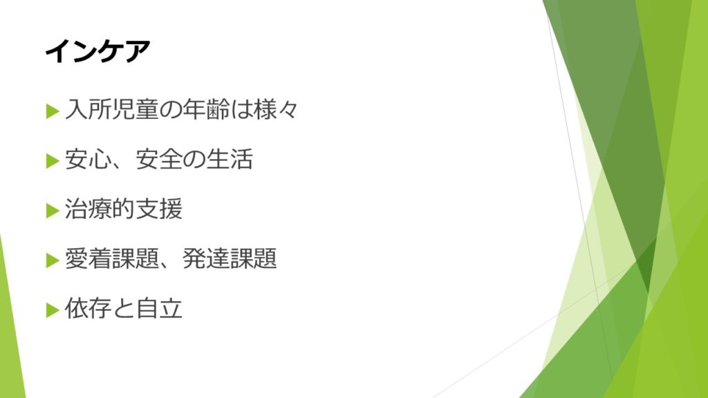 ・インケアの説明の中で依存と自立という内容で私自身は、あまり依存しすぎない方がいいと思っていました。でも、最終的に自立するためには依存するという過程が必要だと説明していただいて考え方が変わりました。私自身も家族に依存して成長して今、一人暮らしできるくらいの自立はできているので、それはどの状況で生きる子供みんなに共通すべきことなんだと考えました。