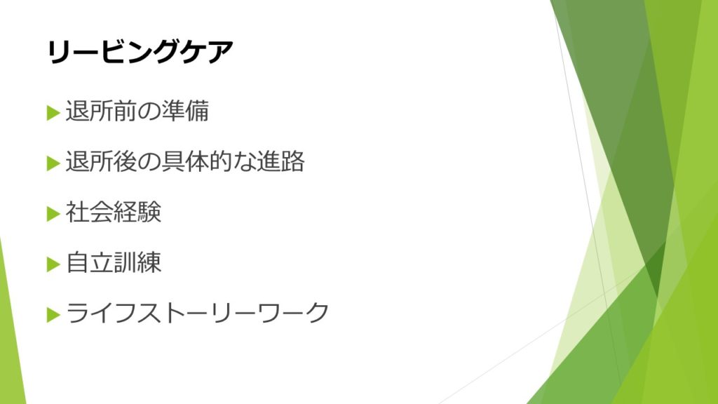 ・児童養護施設のリービングケアで、ライフストーリーを教えることがあるということを初めて知った。ポジティブな伝え方を意識することは大切だと思ったので、リービングケアだけではなく、日常生活でも使えることだと思った