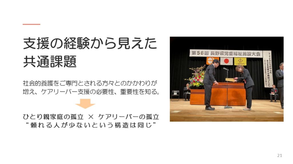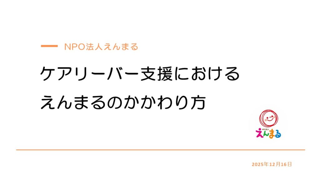 荒井先生のお話の後には、えんまるの岩間千佳より、NPO法人えんまるがおこなっているケアリーバー支援や、各児童養護施設と連携して取り組んでいる支援について、お話をさせていただきました。